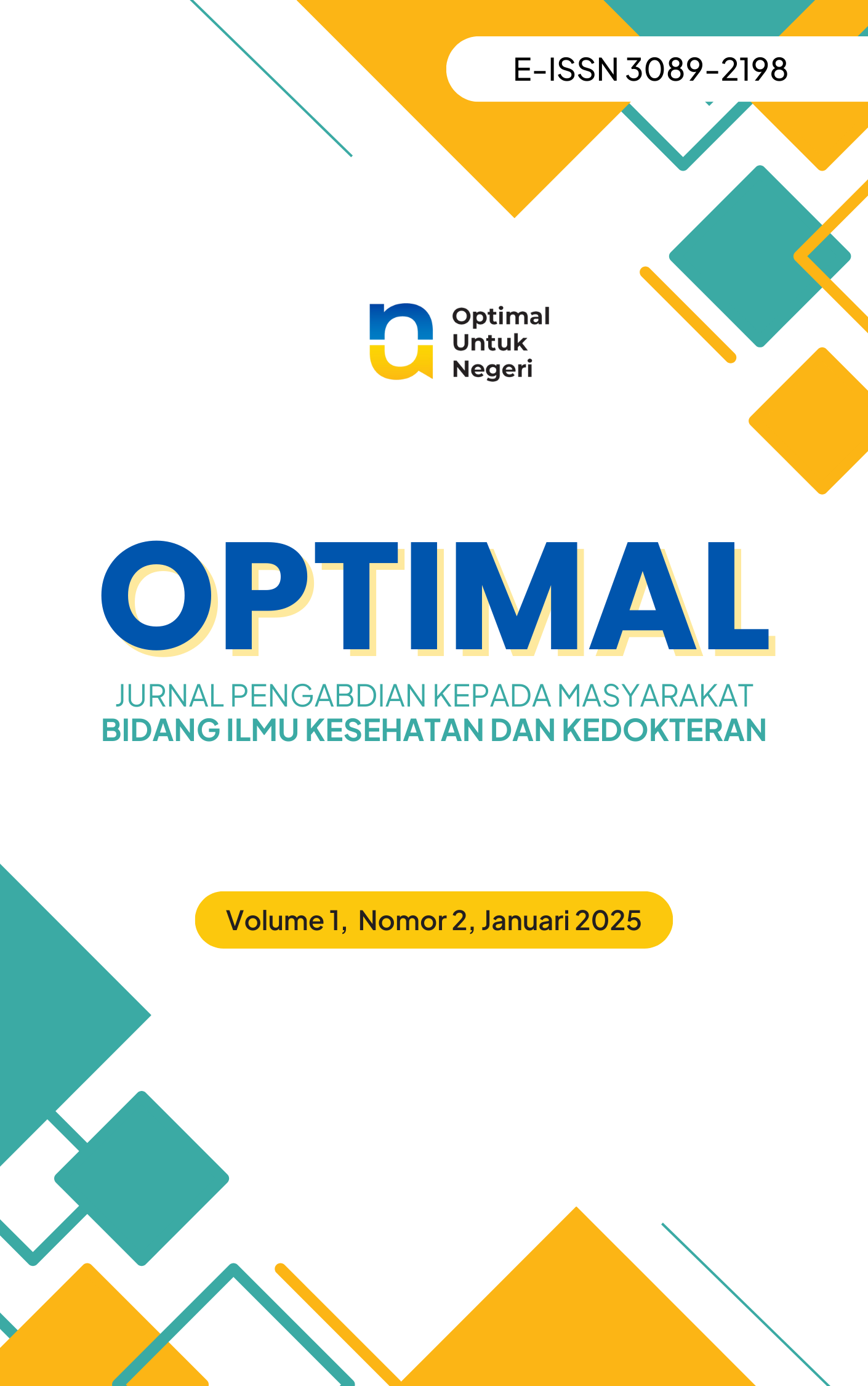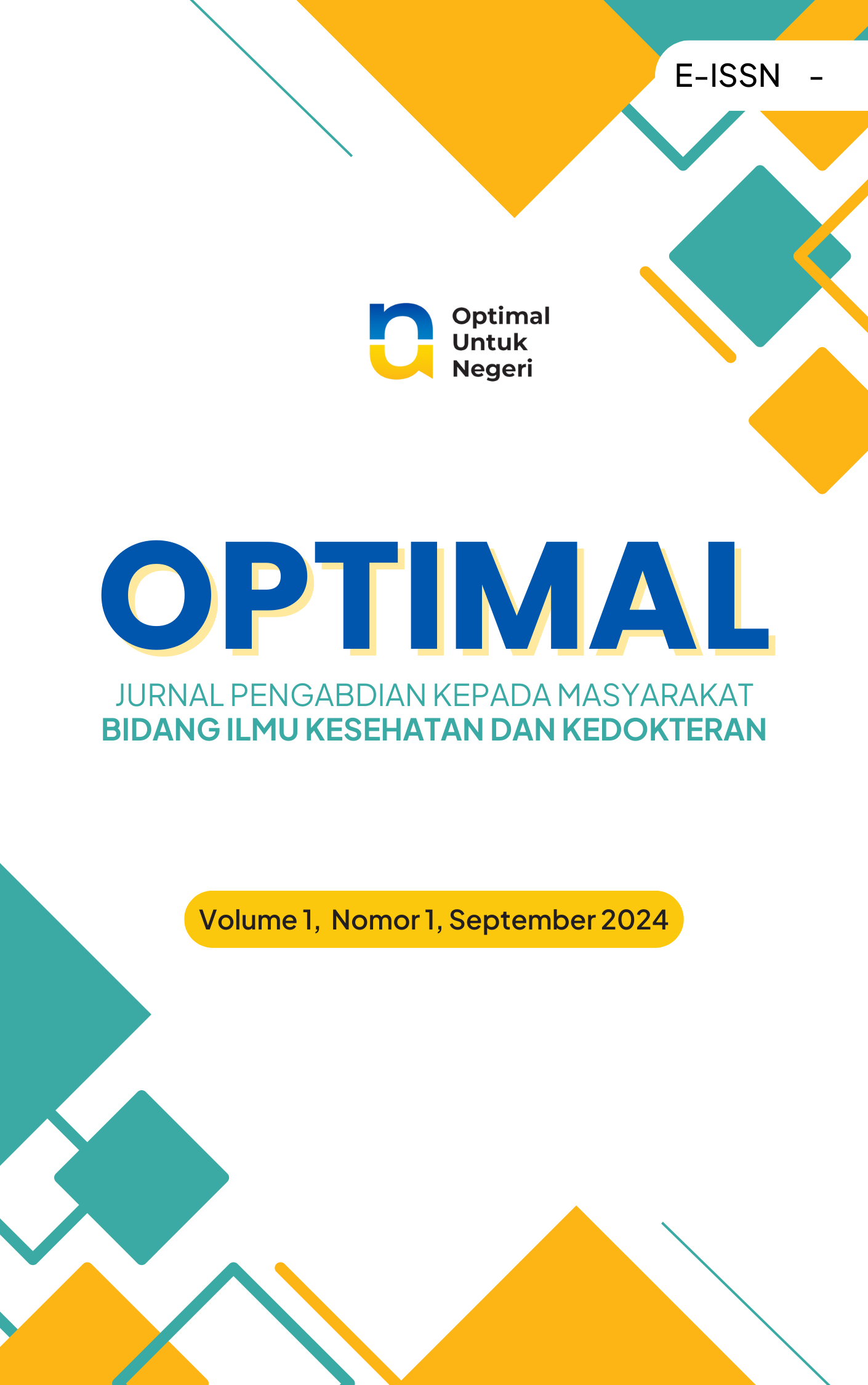 Jurnal Pengabdian Masyarakat Bidang Ilmu Kesehatan dan Kedokteran Optimal merupakan jurnal yang didedikasikan untuk mempublikasikan hasil-hasil pengabdian masyarakat di bidang kesehatan dan kedokteran. Jurnal yang dikelola oleh PT Optimal Untuk Negeri ini merupakan wadah bagi para praktisi, akademisi, dan peneliti untuk bertukar pengalaman dan pengetahuan guna meningkatkan kualitas pelayanan kesehatan dan medis di masyarakat. Melalui jurnal ini, kami berharap dapat menghasilkan pertukaran informasi, penelitian, dan inovasi yang berdampak positif terhadap peningkatan kualitas hidup masyarakat kita. Jurnal Pengabdian Masyarakat Bidang Ilmu Kesehatan dan Kedokteran Optimal bertujuan untuk mendorong pengembangan program kesehatan yang efektif, berbasis bukti, dan memberikan manfaat komprehensif bagi masyarakat.