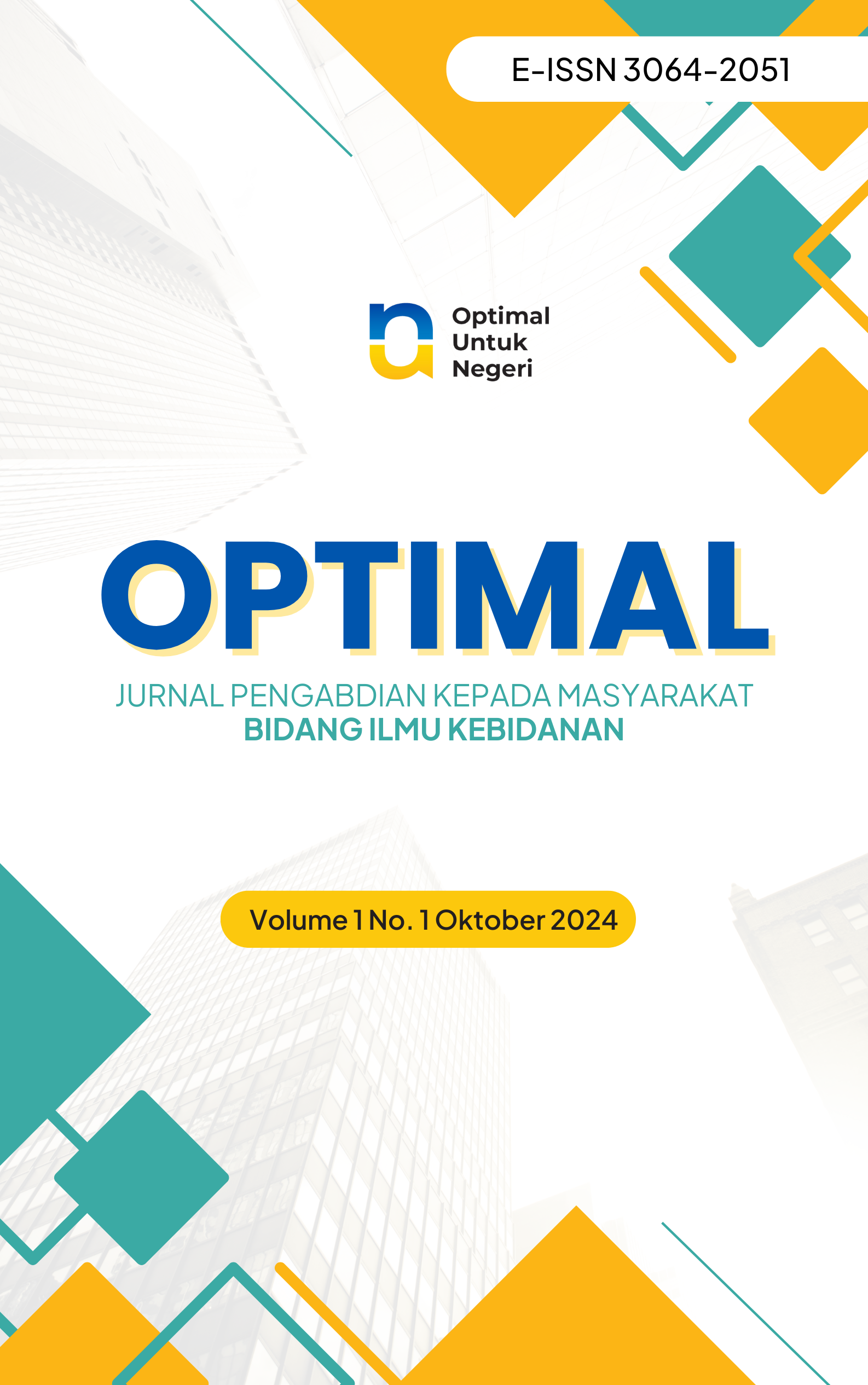 OPTIMAL: Jurnal Pengabdian Kepada Masyarakat Bidang Ilmu Kebidanan merupakan jurnal yang fokus pada publikasi hasil pengabdian kepada masyarakat di bidang kebidanan. Dikelola oleh PT Optimal Untuk Negeri, jurnal ini menjadi wadah bagi para praktisi, akademisi, dan peneliti untuk berbagi pengalaman dan pengetahuan guna meningkatkan kualitas layanan kebidanan di masyarakat.Melalui jurnal ini, diharapkan dapat terwujud pertukaran informasi dan inovasi di bidang kebidanan yang berdampak positif terhadap kesehatan ibu dan anak. Jurnal Pengabdian Kepada Masyarakat Bidang Ilmu Kebidanan juga bertujuan menginspirasi pengembangan program-program kebidanan yang efektif dan bermanfaat bagi masyarakat luas.